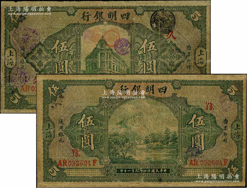 民国十四年(1925年)四明银行德国版绿色四明山图伍圆、绿色行楼图伍圆共2枚不同,分别加印领券“YB”和“久”字,有修补,六至七成新