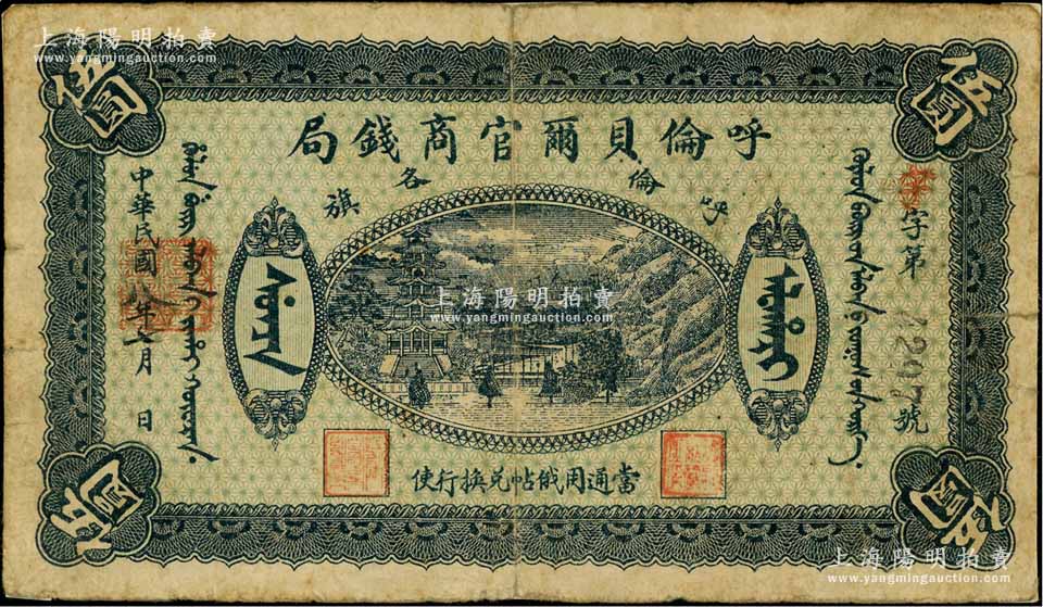 民国八年(1919年)呼伦贝尔官商钱局伍圆,黑色4位数号码券;瑞典藏家出品,背面边侧有贴纸,七成新
