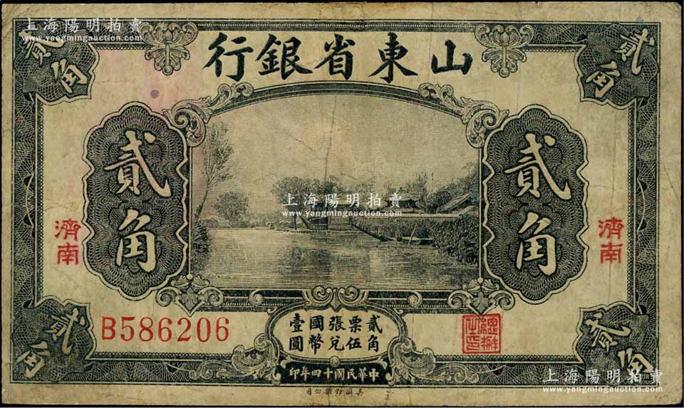 民国十四年(1925年)山东省银行美钞版贰角,济南地名,七至七五成新