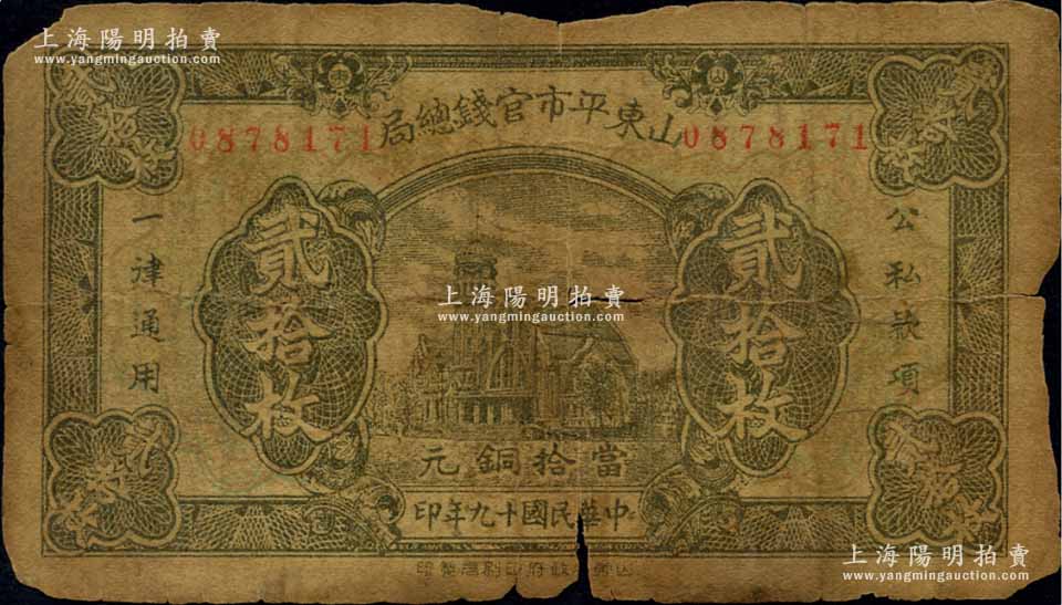 民国十九年(1930年)山东平市官钱总局当拾铜元贰拾枚,属该行之第二版铜元票,存世极为罕见(通常所见均为1936年版);资深藏家出品,有破损,原票近六成新