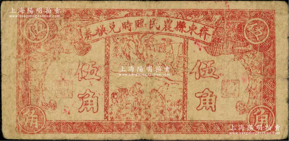 民国三十年(1941年)齐东县农民临时兑换券伍角,属抗战时期山东地方流通券之罕见品,原票七成新