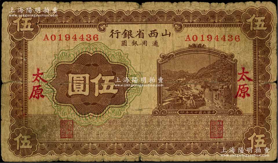 民国十七年(1928年)山西省银行棕色山城图伍圆,太原地名;香港藏家出品,少见,原票七成新