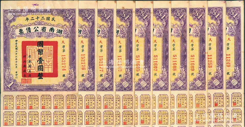 民国二十二年湖南省公债票国币壹圆共10枚,部分连号,均附带有息票,八至八五成新