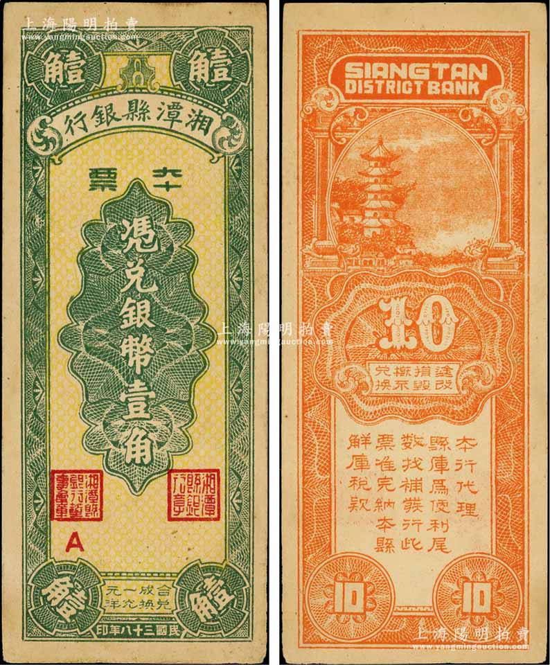 民国三十八年(1949年)湘潭县银行本票银币壹角,南方藏家出品,九成新