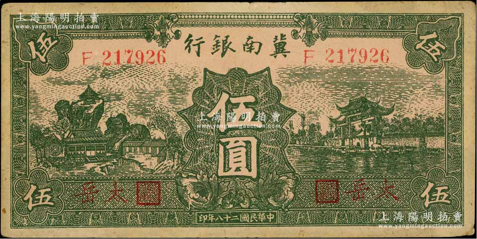 民国二十八年(1939年)冀南银行绿色伍圆,红字“太岳”地名,少见,八五成新