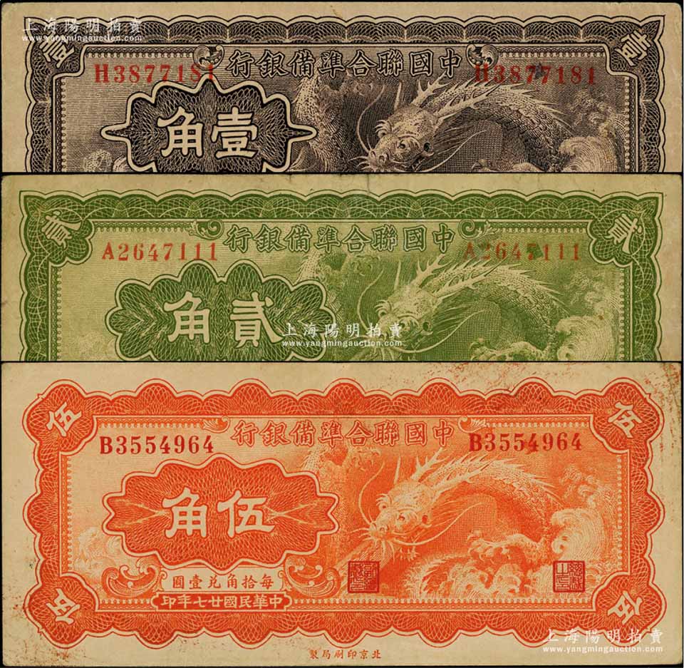 民国廿七年(1938年)中国联合准备银行小龙壹角、贰角、伍角共3枚全套,七至八五成新