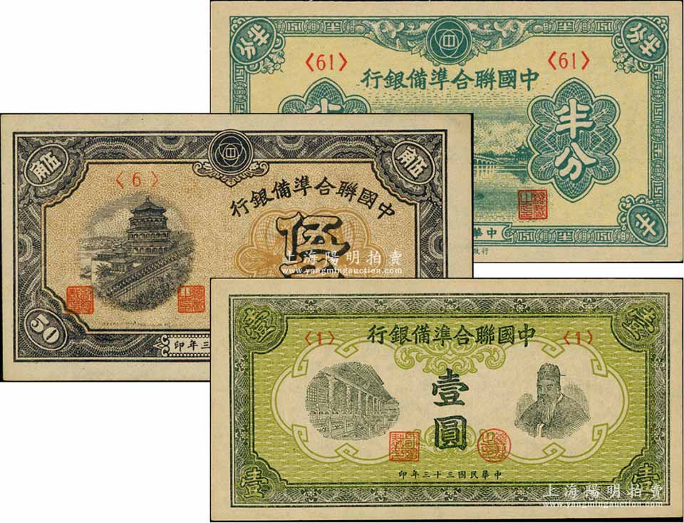 中国联合准备银行纸币3种,详分:1938年半分,1944年伍角、壹圆,九八至全新
