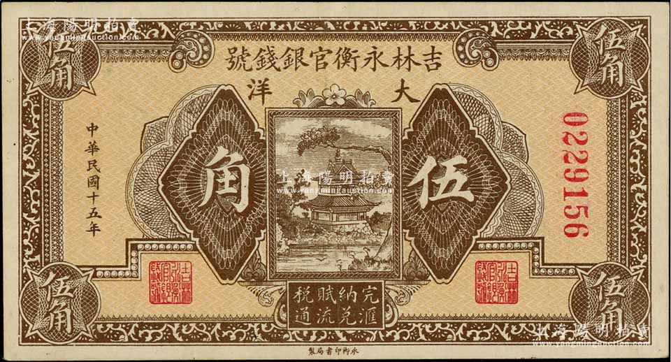 民国十五年(1926年)吉林永衡官银钱号大洋伍角,九成新