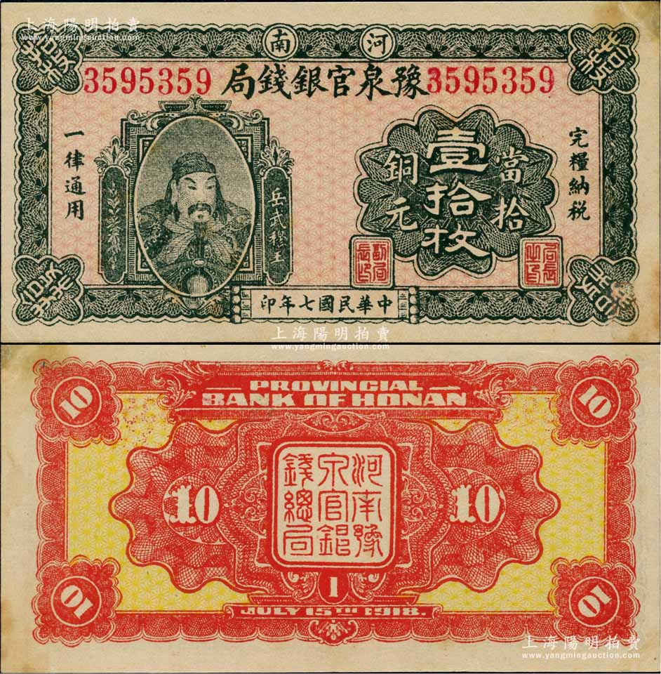 民国七年(1918年)河南豫泉官银钱局当拾铜元壹拾枚,上印武穆王岳飞像;台湾前辈藏家出品,且属难得之一流品相,九五成新