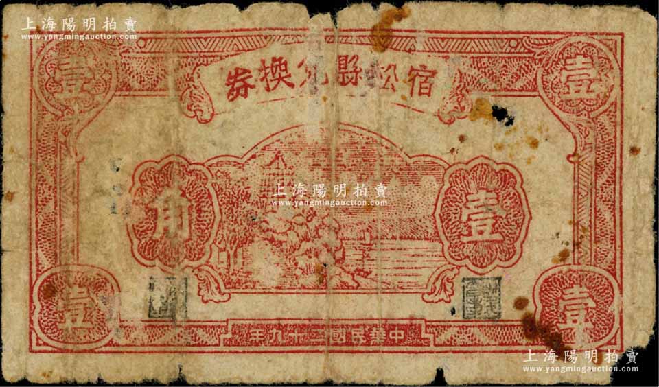 民国二十九年(1940年)宿松县兑换券壹角,上印杭州六和塔图,属抗日地方政府发行,少见,原票六成新