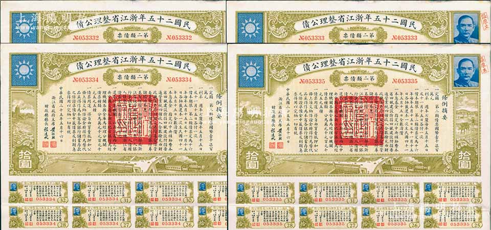 民国二十五年浙江省整理公债·第二类债票拾圆共4枚连号,由浙江省政府主席黄绍竑(国民党要员、新桂系创始人)签署,附带有息票,八五成新