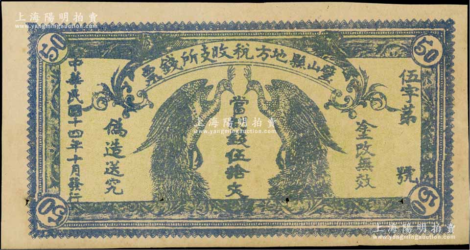 民国十四年(1925年)璧山县地方税收支所钱票·当制钱伍拾文,上印二孔雀,背印发行条例,少见品,有针眼,八成新