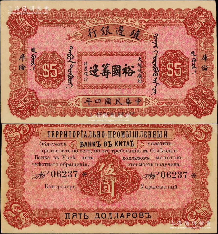 民国四年(1915年)殖边银行伍圆,库伦地名,上印大总统题字“裕国筹边”;刘文和先生藏品,少见,九成新