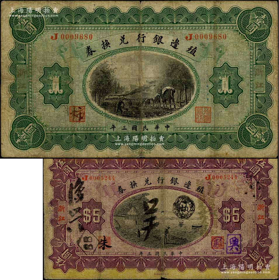 民国三年(1914年)殖边银行兑换券壹圆、伍圆共2枚全套,浙江地名;刘文和先生藏品,源于著名集钞家柏文先生之旧藏,七成新
