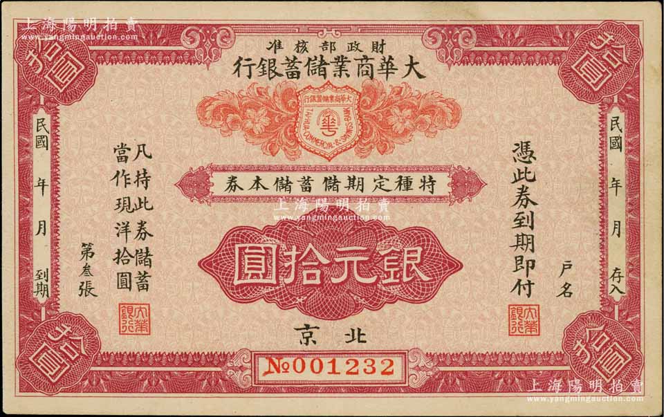 民国年(北京)大华商业储蓄银行·特种定期储蓄储本券银元拾圆,由财政部核准发行;刘文和先生藏品,少见,九成新