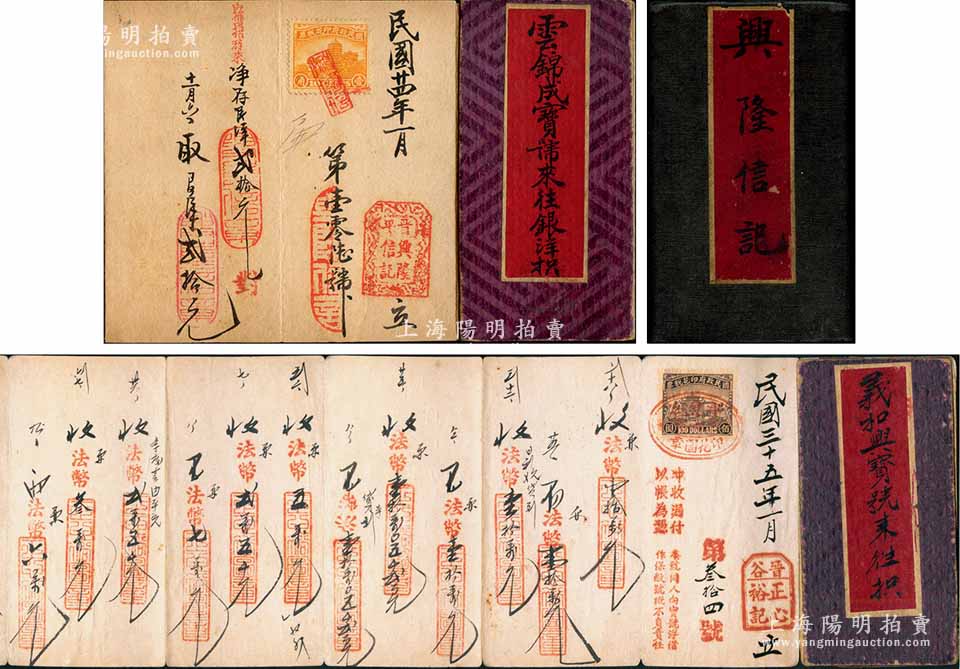 山西晋商银号传统折叠式存摺共2本不同,详分:①民国廿四年(1935年)平遥县“晋平·兴隆信记”发给“云锦成宝号来往银洋摺”1本,附带原封套;②民国三十五年(1946年)太谷县“晋谷·正心裕记”发给“义和兴宝号来往摺”1本,内中记录有11页存取账目;刘文和先生藏品,保存甚佳,敬请预览