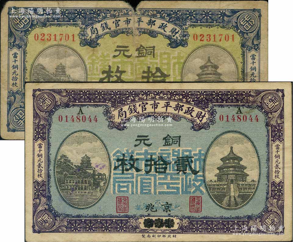 民国八年一月版(1919年)财政部平市官钱局铜元拾枚、贰拾枚共2种不同,分别为京兆和烟台改京兆地名;刘文和先生藏品,六五至八成新