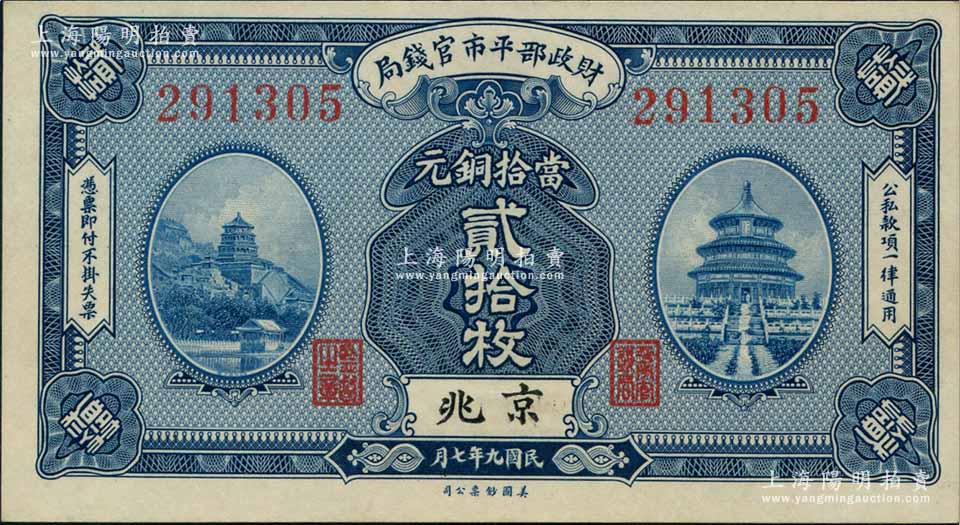民国九年(1920年)财政部平市官钱局美钞版当拾铜元贰拾枚,京兆地名;刘文和先生藏品,全新
