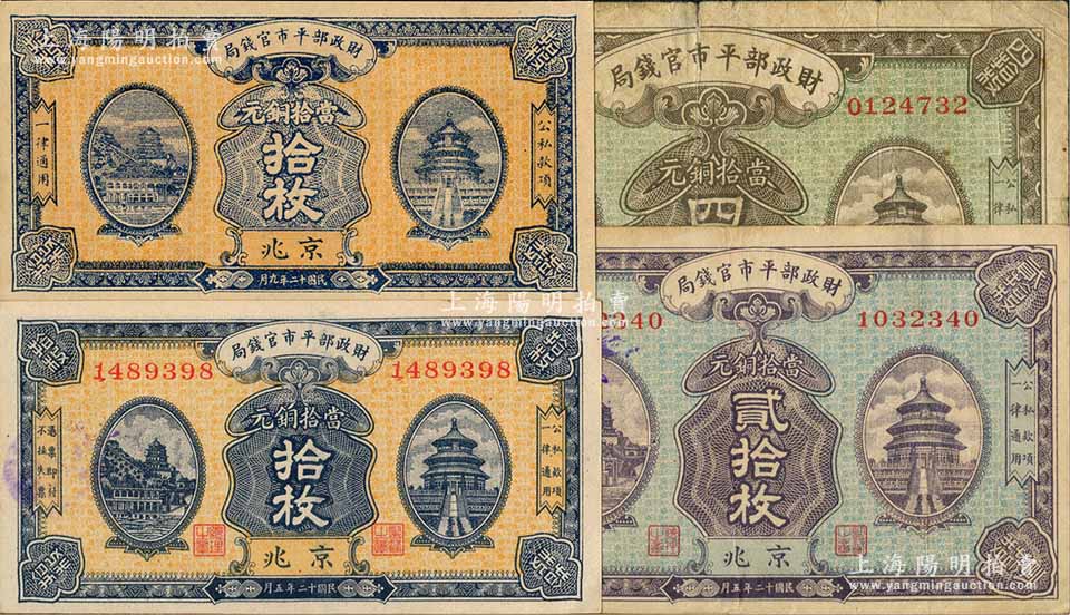 财政部平市官钱局铜元票4种,详分:1923年5月版拾枚、贰拾枚、四拾枚,1923年9月版拾枚,均为京兆地名;刘文和先生藏品,七成至全新