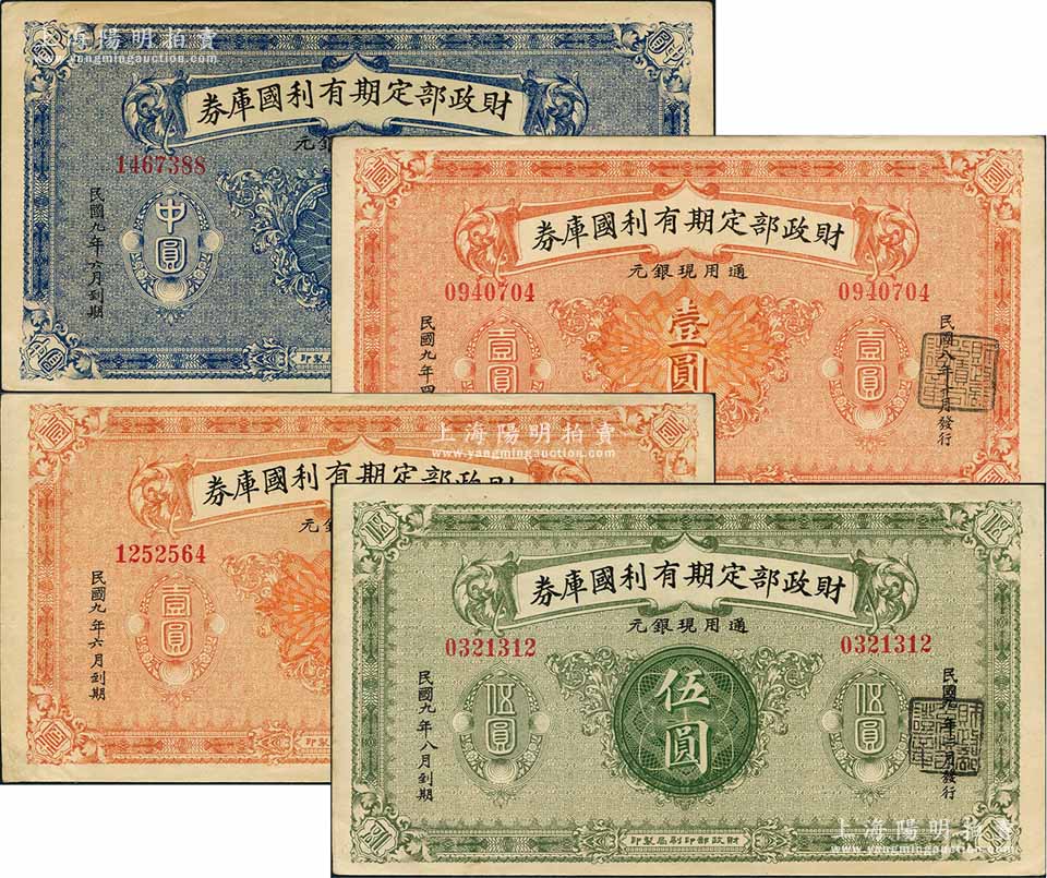 财政部定期有利国库券共4种,详分:1919年10月发行之中圆1枚,1919年10月和12月发行之壹圆2枚,1920年2月发行之伍圆1枚;刘文和先生藏品,八五至九成新