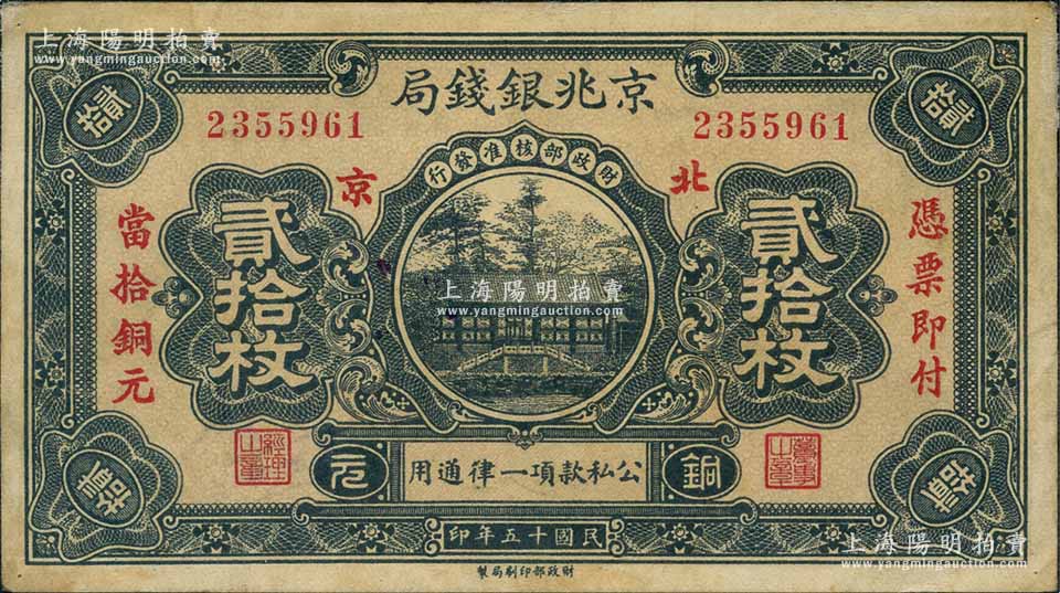 民国十五年(1926年)京兆银钱局铜元贰拾枚,行名下“北京”地名,左右分印“凭票即付当拾铜元”红字,属第一期头版发行券;刘文和先生藏品,罕见,原票八成新