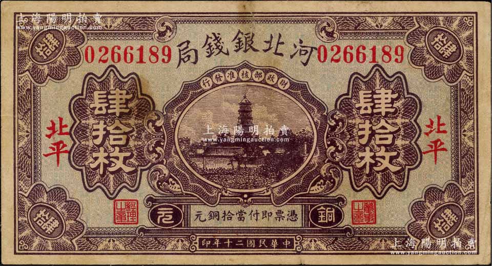 民国二十年(1931年)河北银钱局铜元肆拾枚,北平地名,上印宝塔图(后期券为房屋图),此年份券极为罕见;刘文和先生藏品,原票七五成新