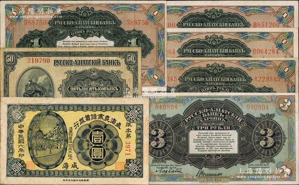 纸币7枚,详分:威海农业储蓄银行1917年壹圆,威海地名,截角回收票;华俄道胜银行中东铁路券(1917年)50戈比、壹圆、叁圆无字轨各1枚、壹圆单字轨3枚;其中1枚有修补,七至八成新,敬请预览