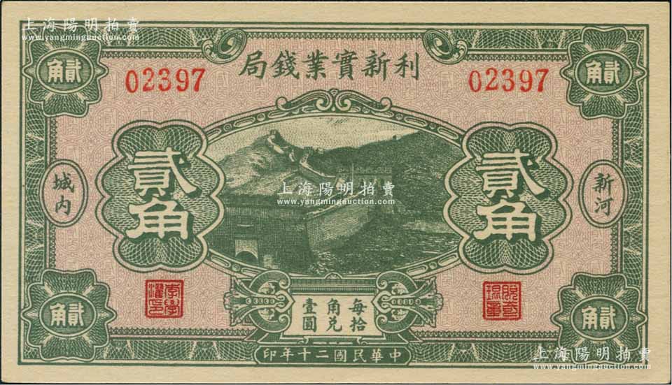 民国二十年(1931年)利新实业钱局贰角,新河地名,财政部印刷局印制,上印长城图,但票上号码系后盖,九八成新