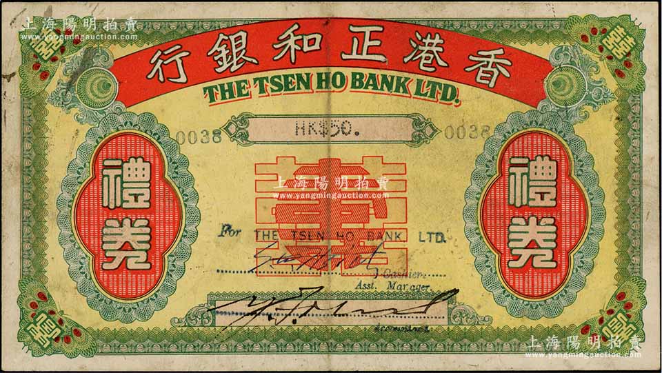 1947年香港正和银行礼券港币伍拾圆,上印“囍寿用”字样;源于香港藏家马德和先生之旧藏,流通票罕见,八成新