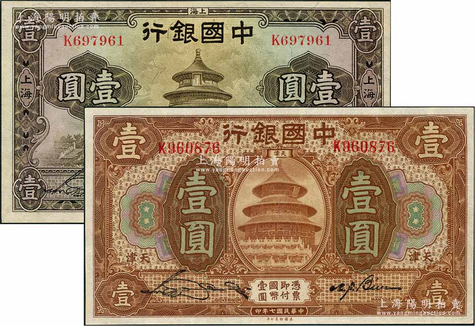 中国银行1918年棕色天津壹圆、1935年华德路版上海壹圆共2枚不同,均为单字轨,九八成新
