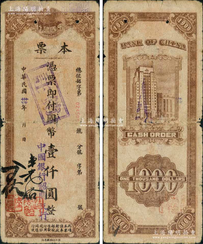 民国卅四年(1945年)中国银行本票国币壹仟圆,中国银行韶关支行发行,由副理连光裕、出纳陆君佐签名,浙江印刷厂承印;资深藏家出品,少见,品相自然,七成新