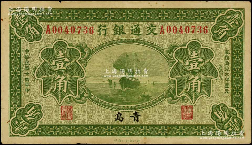 民国十四年(1925年)交通银行壹角,青岛地名,单字轨,梁士诒·李锺楚签名;江南藏家出品,八成新