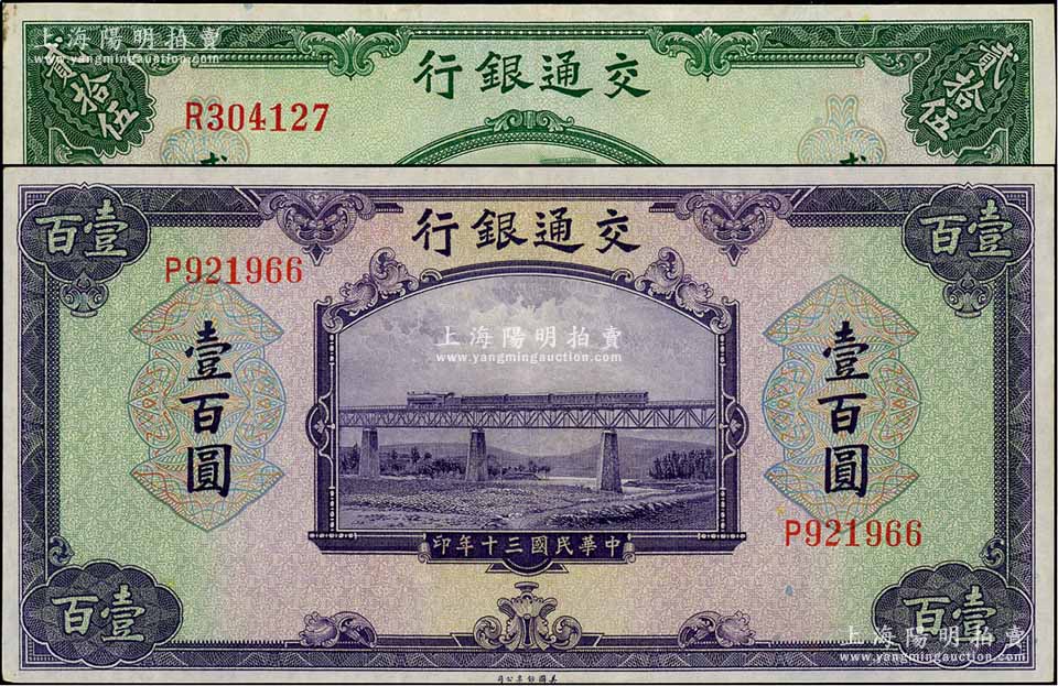 民国三十年(1941年)交通银行美钞版贰拾伍圆、壹百圆共2枚不同,均为单字轨;资深藏家出品,八五至九五成新,敬请预览