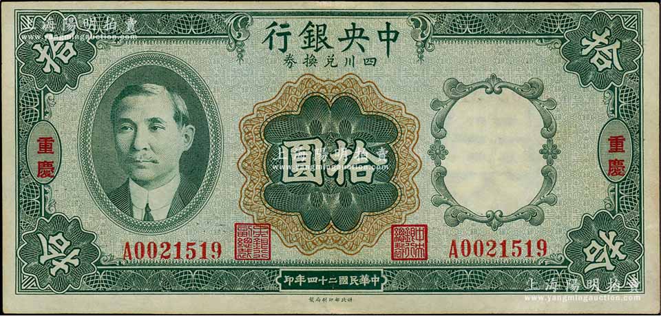 民国二十四年(1935年)中央银行四川兑换券拾圆,重庆地名,近九成新