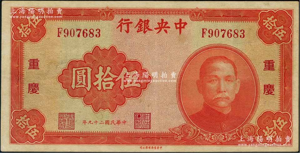 民国二十九年(1940年)中央银行中华版伍拾圆,重庆地名,九五成新