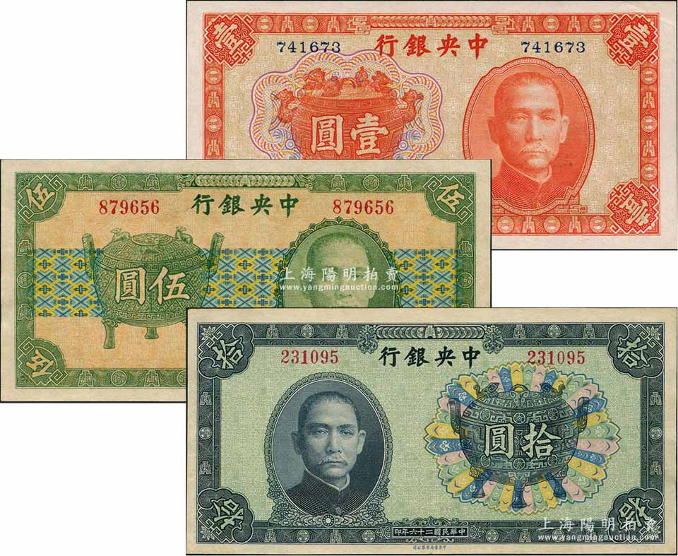 中央银行中华版宝鼎图1936年壹圆、1937年伍圆、拾圆共3枚全套,均为无字轨,孔祥熙·李觉签名,九至九八成新,敬请预览