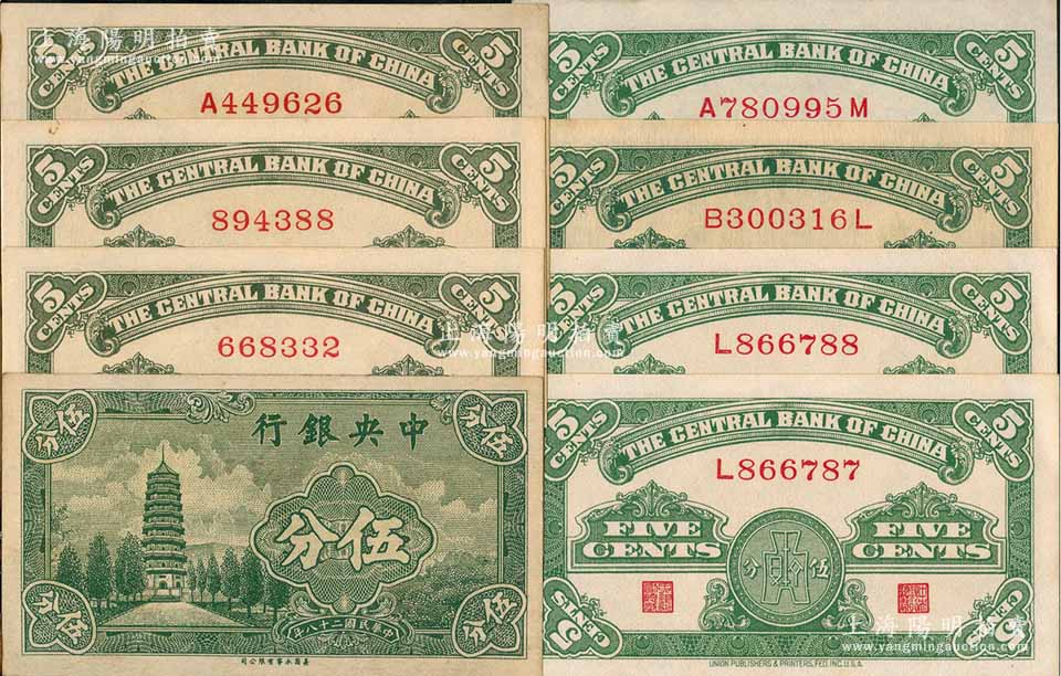 民国二十八年(1939年)中央银行美商永宁版伍分不同版式2套共8枚,内含:大厂名无字轨、单字轨、小厂名单字轨、前后字轨各2枚;前辈藏家出品,除1枚八五成外,其余约九五至全新,敬请预览