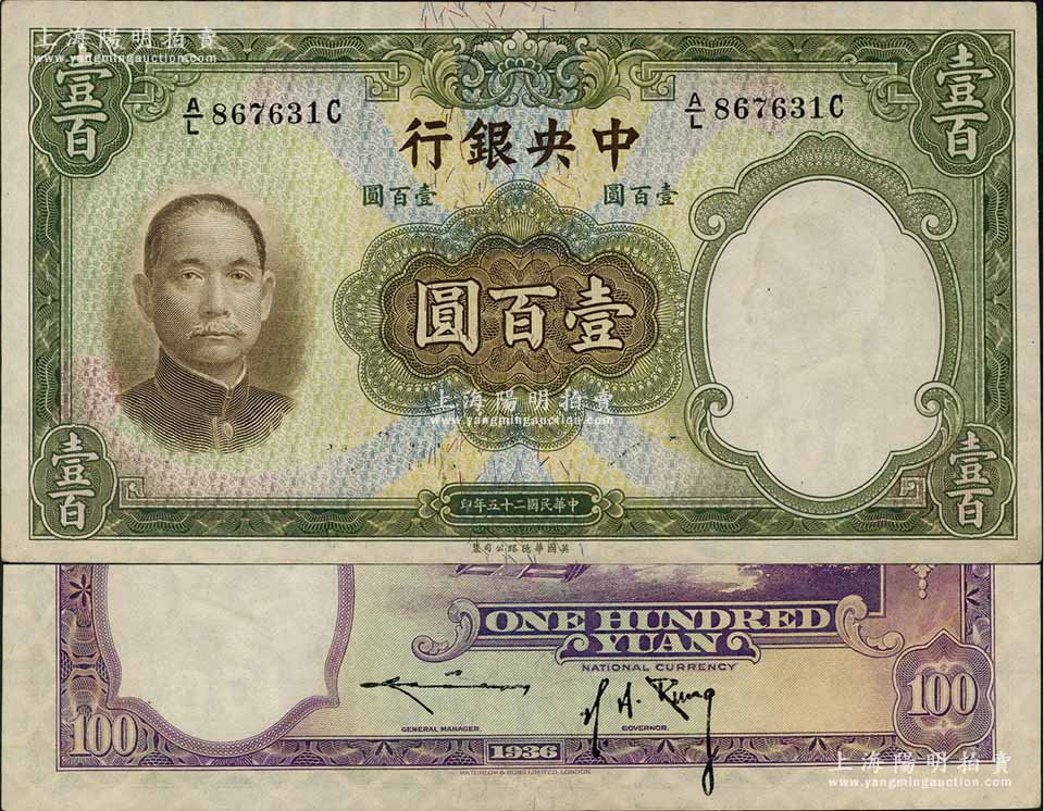 民国二十五年(1936年)中央银行华德路版壹百圆,背为孔祥熙·李骏耀黑色长脚签名,此种版式存世少见,九五成新