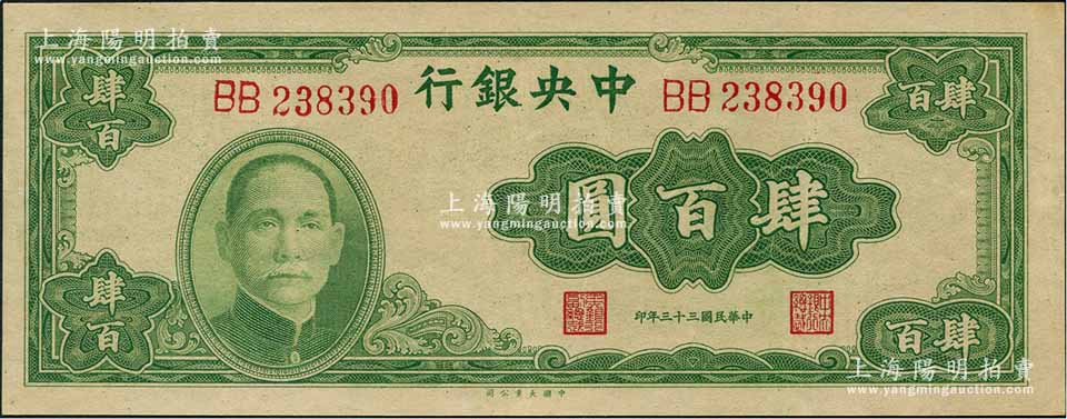 民国三十三年(1944年)中央银行大业版肆百圆,双字轨,九五成新