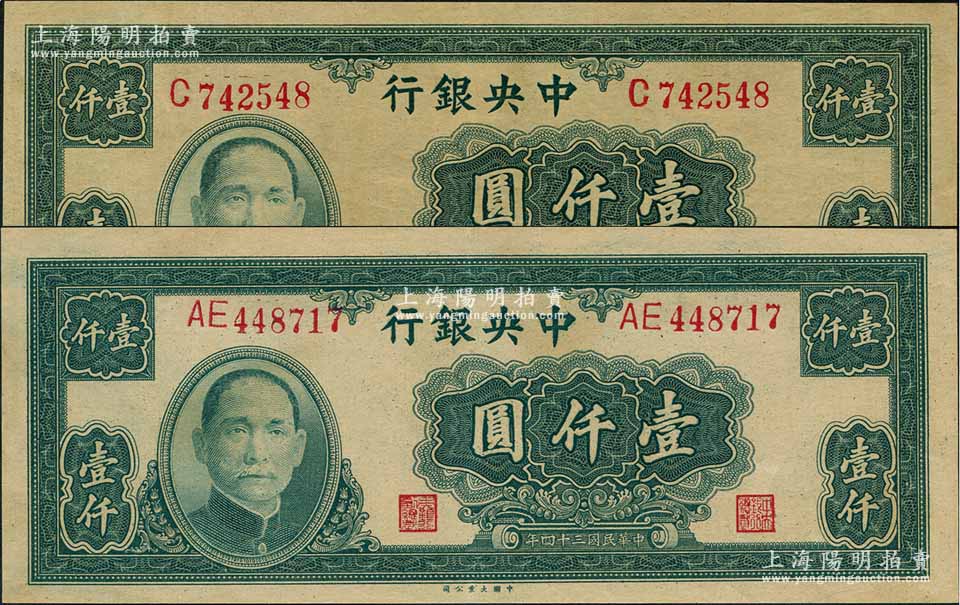 民国三十四年(1945年)中央银行大业版壹仟圆共2枚不同,分别为单字轨和双字轨,九五至九八成新