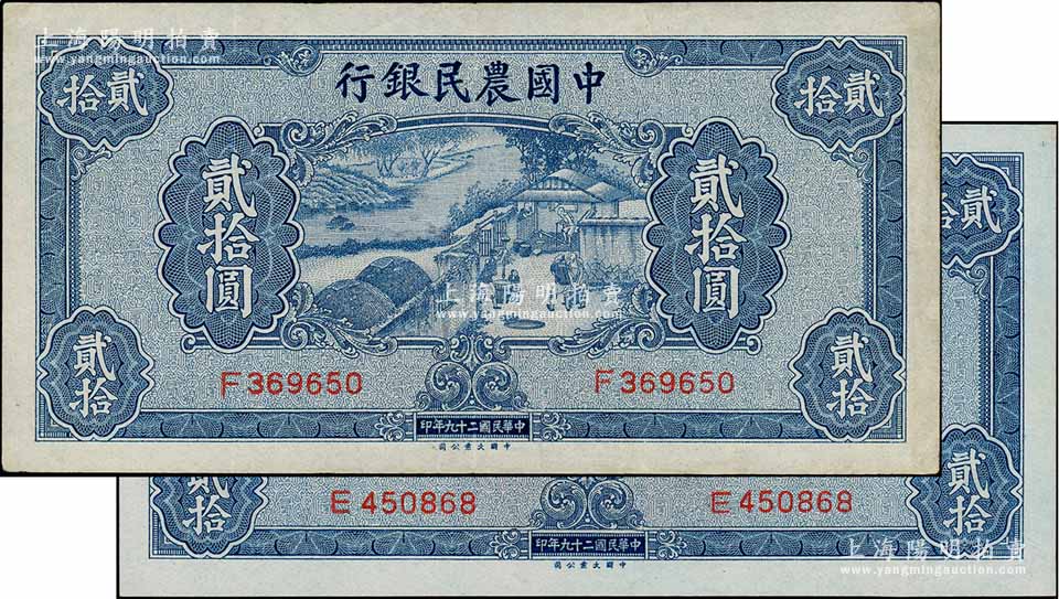 民国二十九年(1940年)中国农民银行贰拾圆共2枚,九至九五成新