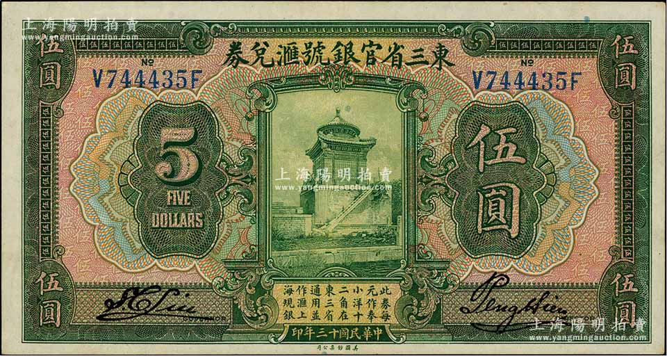 民国十三年(1924年)东三省官银号汇兑券伍圆,九成新