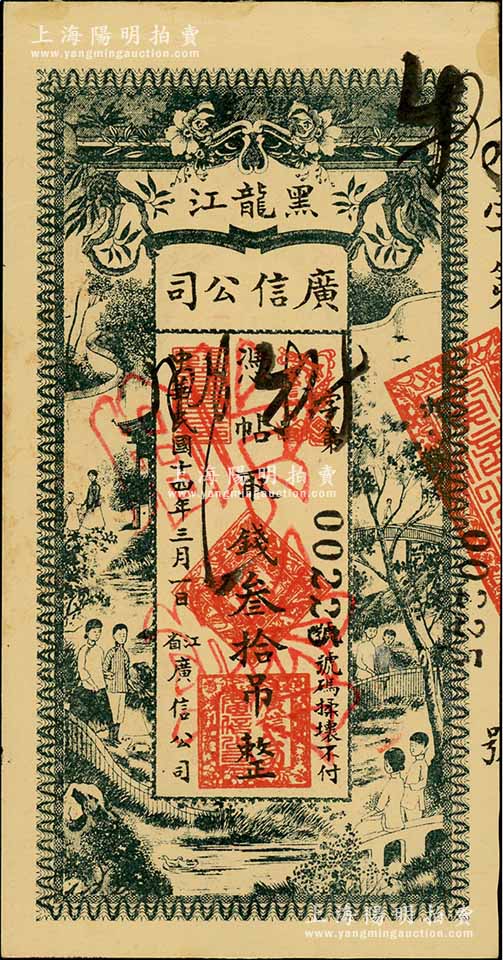 民国十四年(1925年)黑龙江广信公司叁拾吊,正票改作票样,资深藏家出品,未折九五成新