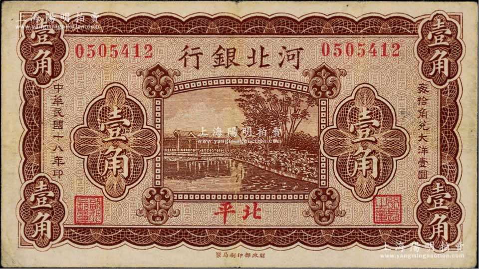 民国十八年(1929年)河北银行壹角,第一版“北平”地名,无字轨,其正面职章为“行长之章”和“副行长章”,背印行长梁新明和副行长陈裕祺英文签名;资深藏家出品,少见,近八成新