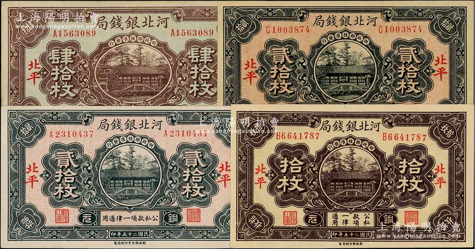 民国二十五年(1936年)河北银钱局铜元票4种,详分:拾枚、浅色版贰拾枚、深色版贰拾枚、肆拾枚,北平地名;资深藏家出品,除1枚为八五成新外,其余3枚均全新