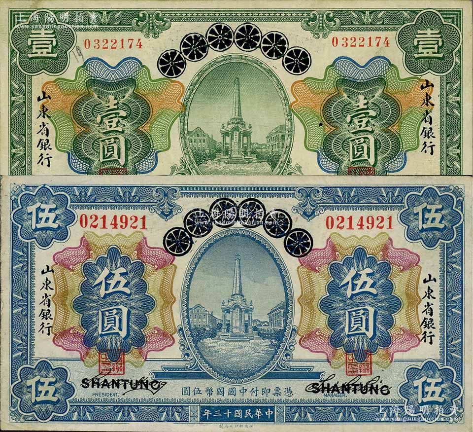民国十三年(1924年)青岛地方银行改山东省银行壹圆、伍圆共2枚不同,资深藏家出品,源于日本名家森本勇先生之旧藏,八五成新