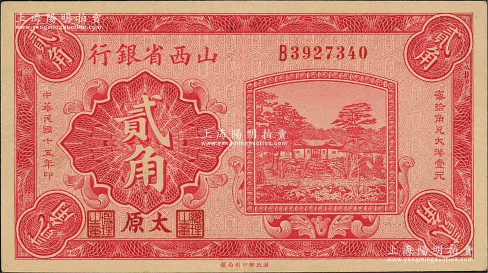 民国十五年(1926年)山西省银行贰角,太原地名,背印C. Y. Chia和Y. C. Hsü签名;资深藏家出品,九成新