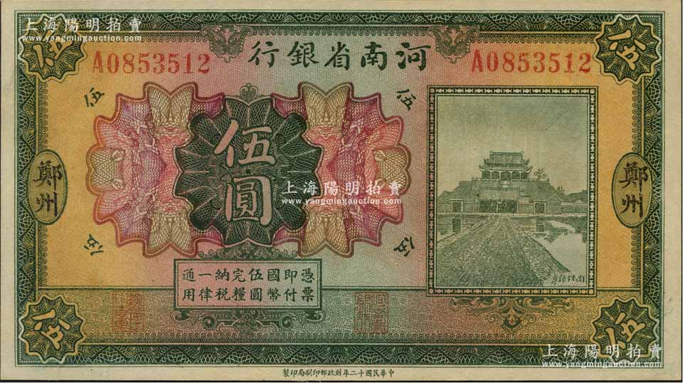 民国十二年(1923年)河南省银行开封龙亭图伍圆,大“郑州”地名,少见,九五成新