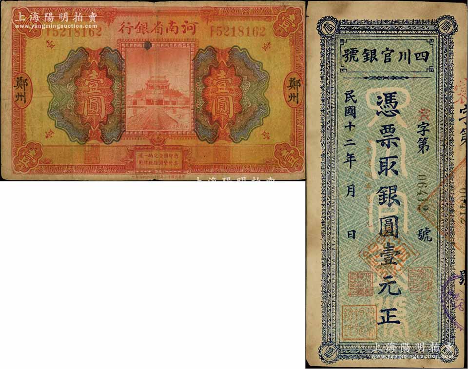 省钞2种,详分:河南省银行1923年壹圆,属少见之大“郑州”地名;四川官银号1923年竖式壹元,背盖“成都总商会章”等;台湾藏家出品,原票七至七五成新