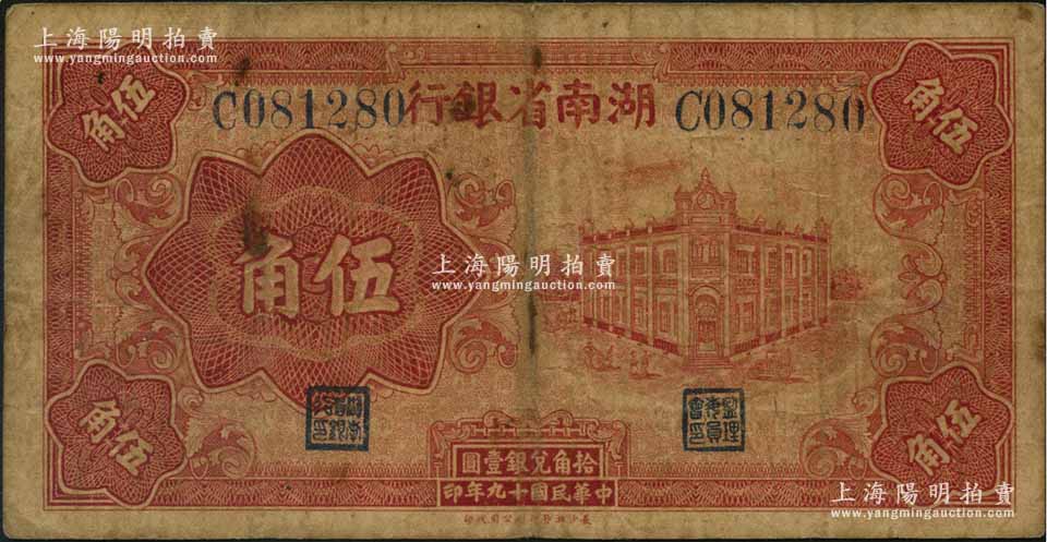 民国十九年(1930年)湖南省银行湘鄂版红色伍角,此乃该行之第一套辅币券,存世颇为稀见;资深藏家出品,原票七五成新